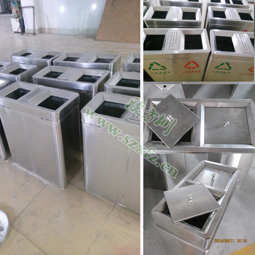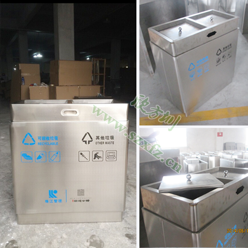 這批C185分類環保垃圾桶是采用304#優質不銹鋼材料模壓成型,厚度足1.2mm,里面配置了厚度為0.4mm的鍍鋅板內桶,堅固耐用,不易破損。垃圾桶外觀為方形,閃爍著金屬的亮澤,高雅美觀,在制作方面也有精良的做工,注重細節的處理,做到無利口,不傷手! 桶身雙分類,正面絲印有“不可回收”和“其他垃圾”的分類標志,具有耐火安全,抗高低溫,適合各種惡劣氣候條件,再加上產品表面光滑,亮麗廣泛適用于各種場所,是電梯口、寫字樓、學校、物業、賓館、酒店、機場、汽車站等擺放場地的首選。